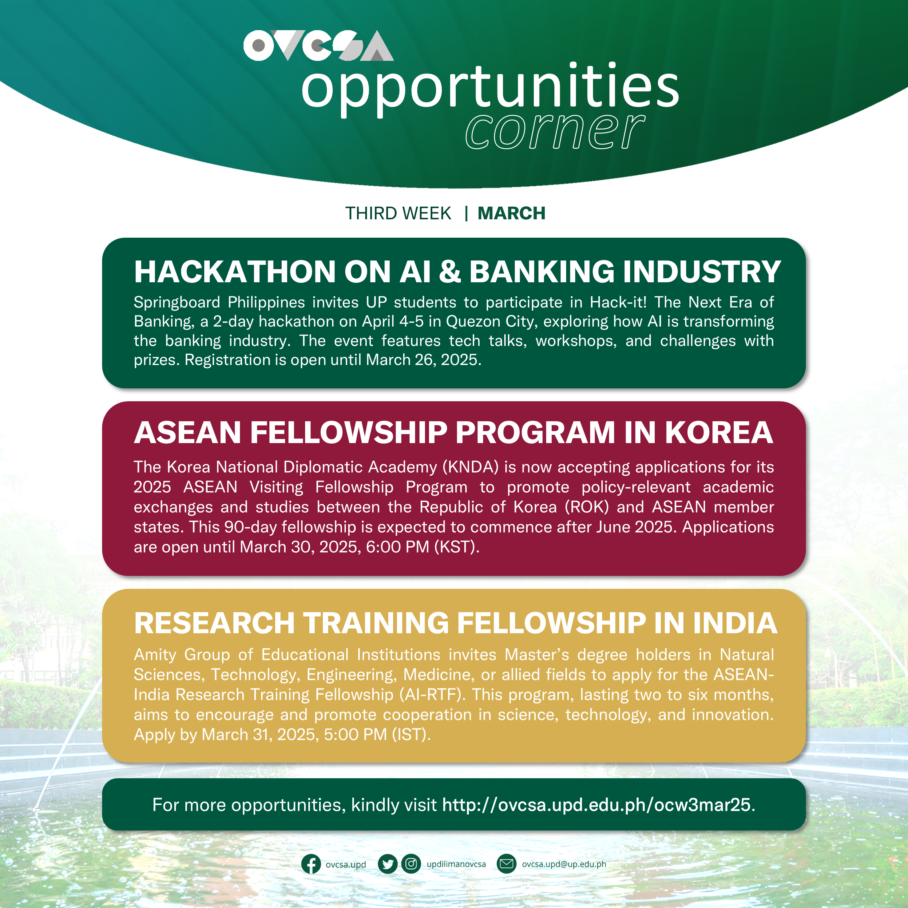 Hello there! The UP Diliman Office of the Vice Chancellor for Student Affairs’ #OpportunitiesCorner is an update on available scholarships, exchange programs, conferences, workshops, and other skill-enhancing initiatives for UP Diliman students. Here’s for the 3rd week of March 2025:
