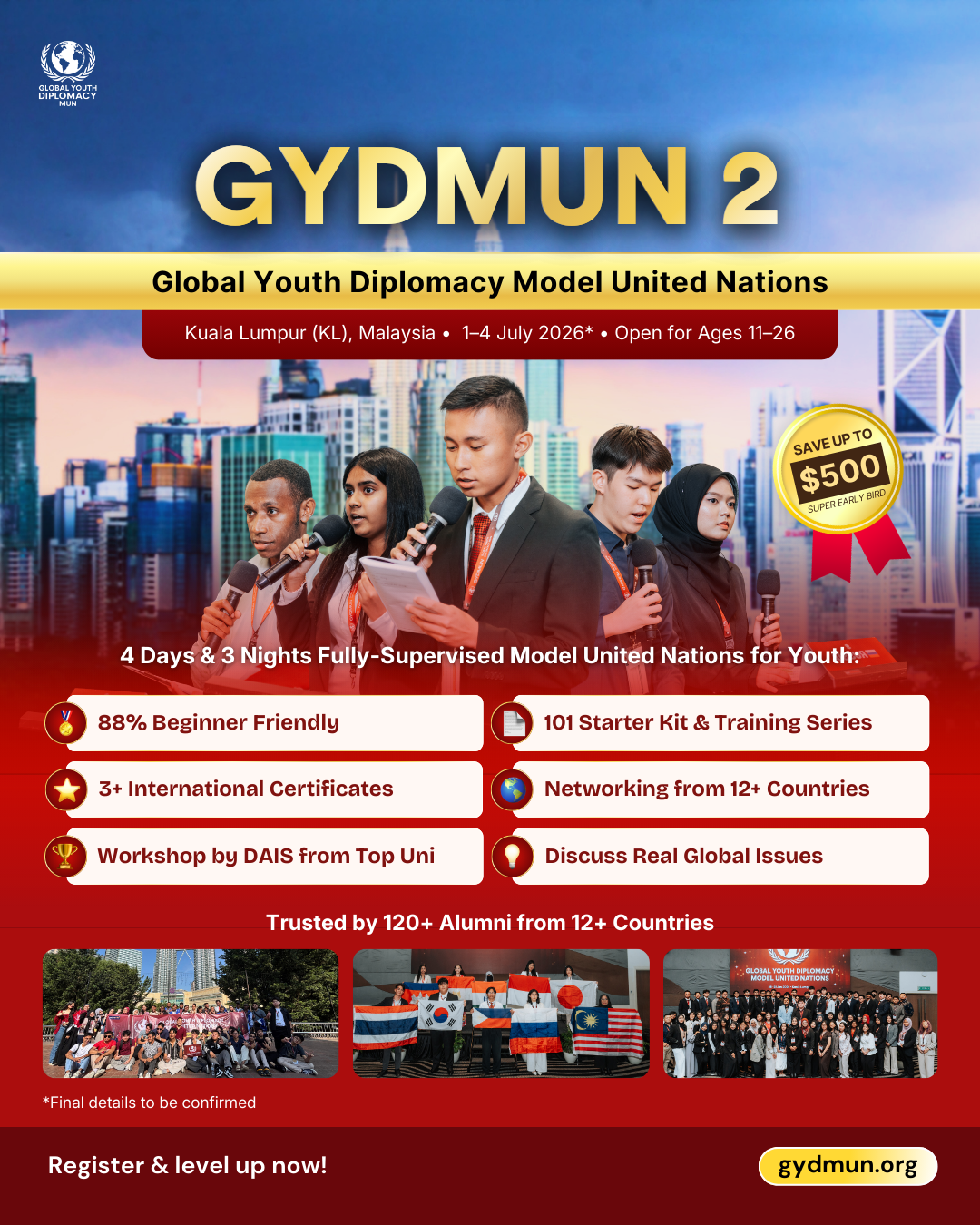 Applications are now open for the Global Youth Diplomacy Model United Nations (GYDMUN), happening on 1–4 July 2026 at Berjaya Times Square, Kuala Lumpur, Malaysia.
