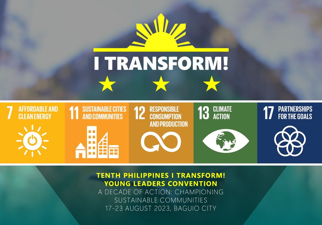 We are pleased to invite you and your organization to the Tenth Philippines I Transform! Young Leaders Convention (PITYLC) on 17 to 22 August 2023 at the Teacher’s Camp, Baguio City with the theme, “A Decade of Action: Championing Sustainable Communities” The PITYLC galvanizes action among young leaders and their partners to help solve development challenges in their communities with the SDGs as framework.