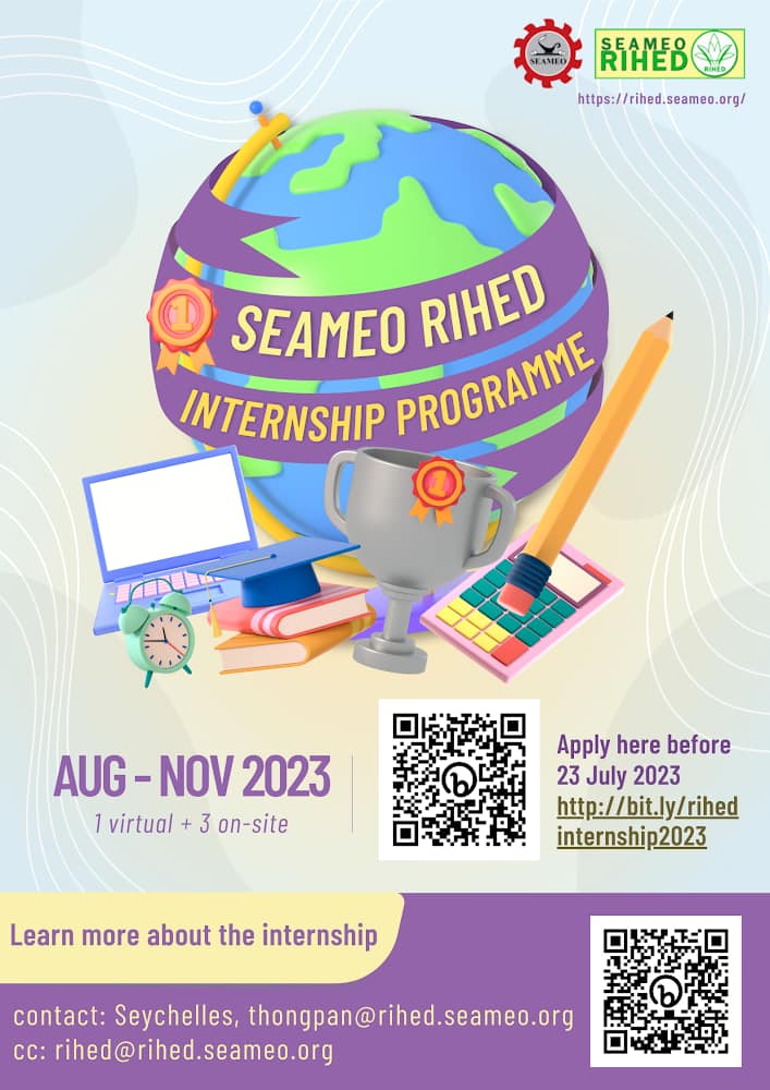 We are inviting third-year, fourth-year students, and recent graduates to apply for SEAMEO RIHED’s Virtual-Physical Internship program from August to November 2023. Don’t miss this chance to gain valuable experience in international project management and inter-governmental relations.