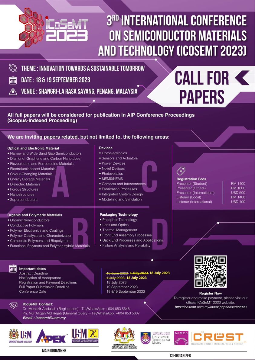 Abstract submission for the 3rd International Conference on Semiconductor Materials and Technology (ICoSeMT 2023) is now open! We encourage researchers to submit their abstracts on topics related to Semiconductor Materials and Technology. For a comprehensive list of covered areas, please visit their website at http://icosemt.usm.my/.