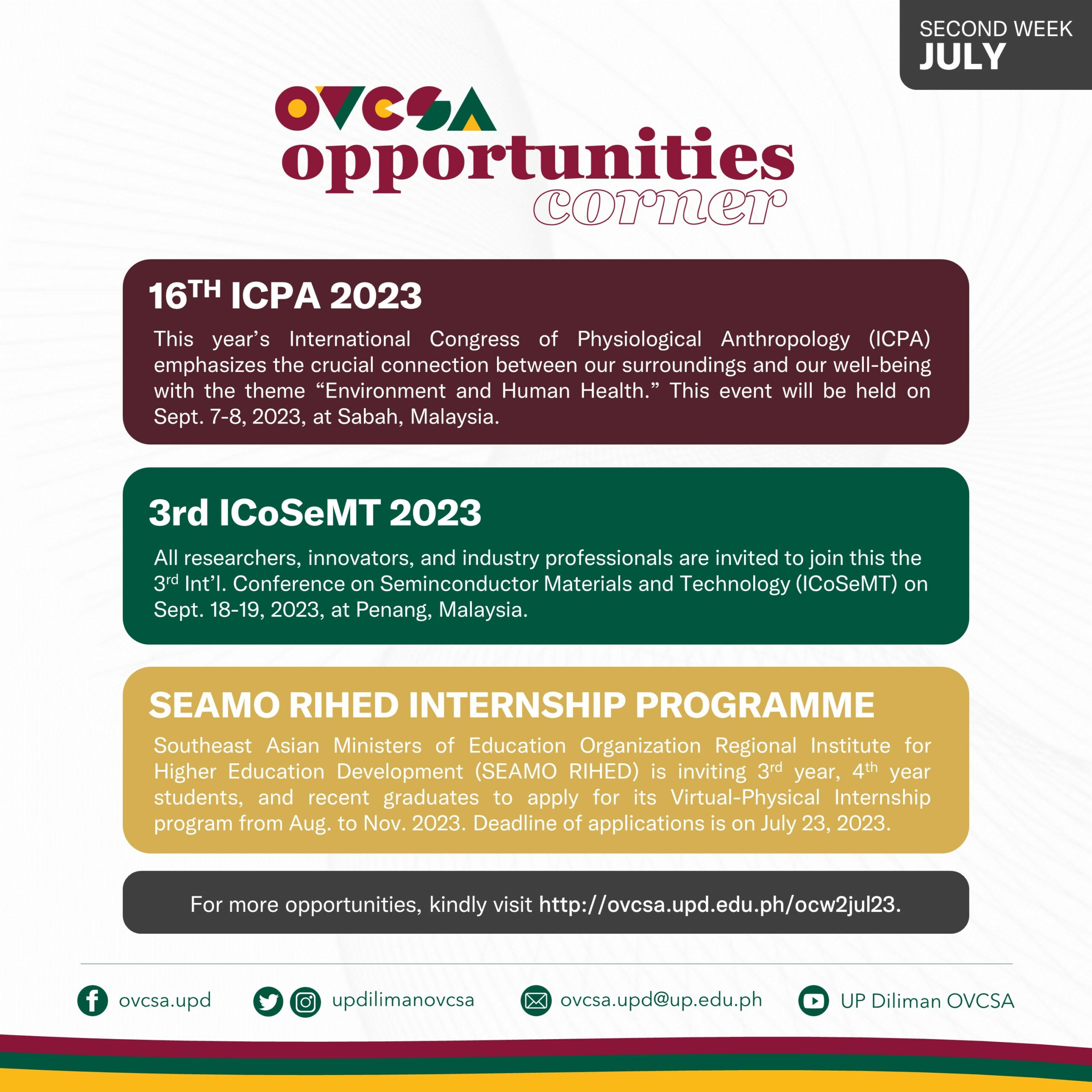 Hello there! The UP Diliman Office of the Vice Chancellor for Student Affairs’ #OpportunitiesCorner is an update on available scholarships, exchange programs, conferences, workshops, and other skill-enhancing initiatives for UP Diliman students. Here’s for the 2nd week of July 2023!