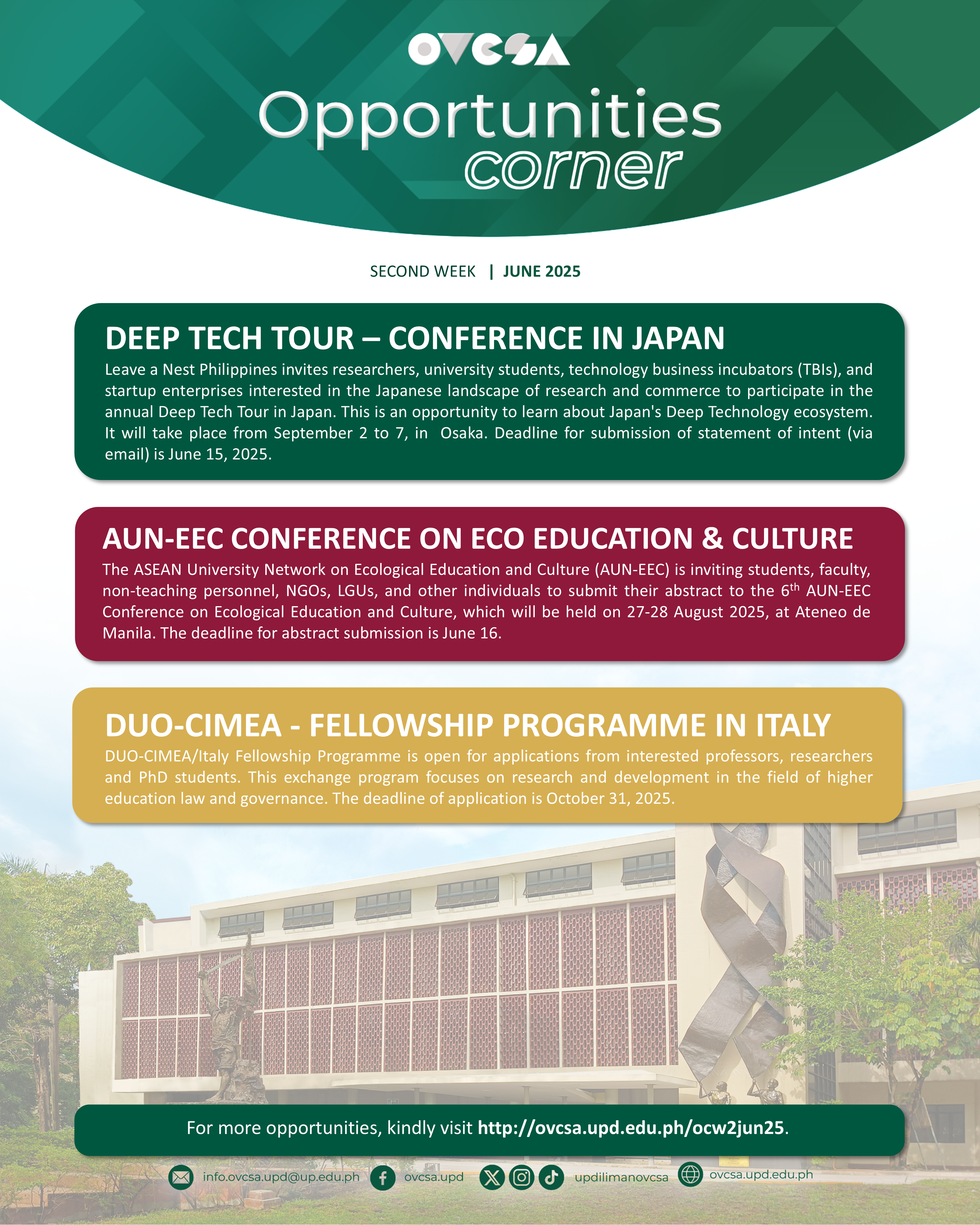 Hello there! The UP Diliman Office of the Vice Chancellor for Student Affairs’ #OpportunitiesCorner is an update on available scholarships, exchange programs, conferences, workshops, and other skill-enhancing initiatives for UP Diliman students. Here’s for the 2nd week of June 2025: