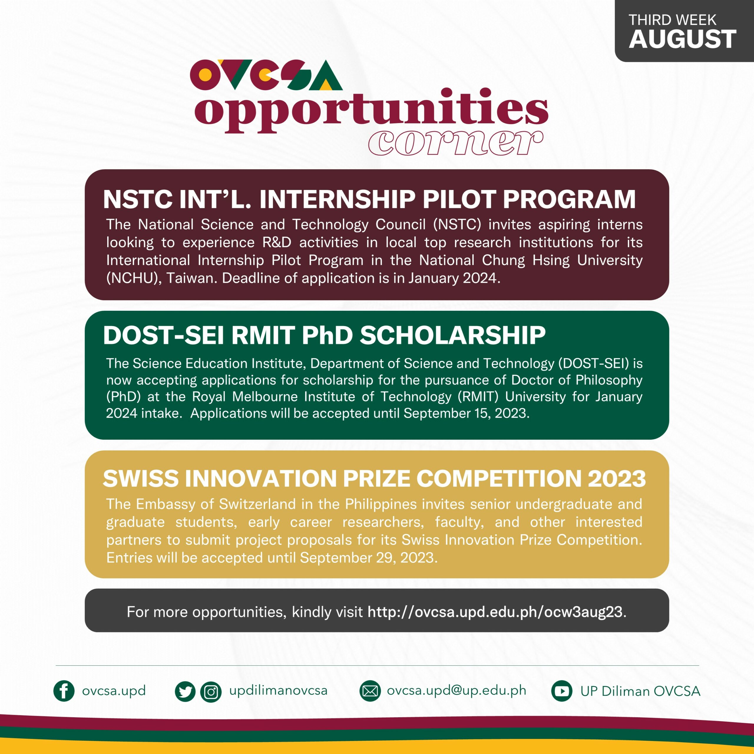 Hello there! The UP Diliman Office of the Vice Chancellor for Student Affairs’ #OpportunitiesCorner is an update on available scholarships, exchange programs, conferences, workshops, and other skill-enhancing initiatives for UP Diliman students. Here’s for the 3rd week of August 2023!
