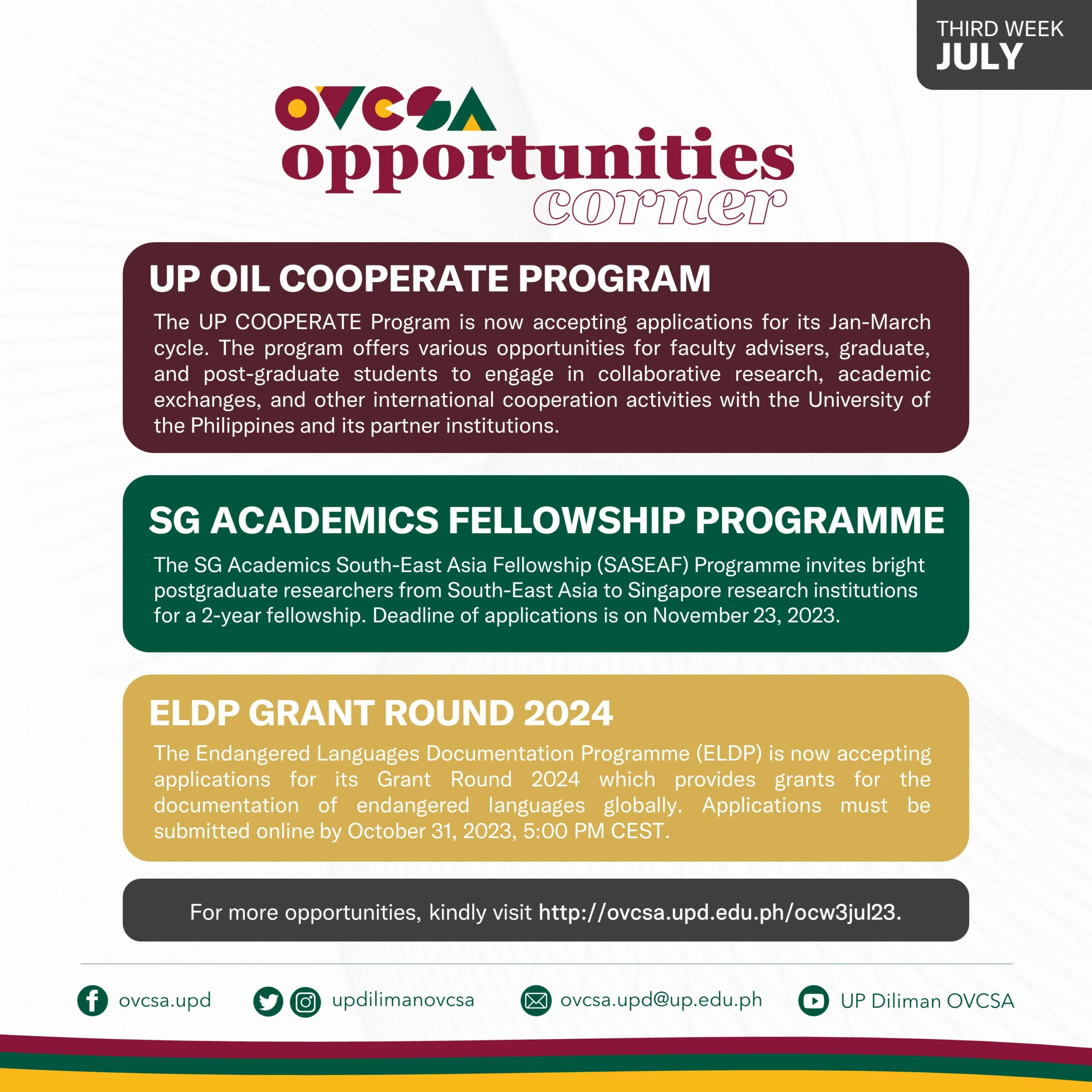 Hello there! The UP Diliman Office of the Vice Chancellor for Student Affairs’ #OpportunitiesCorner is an update on available scholarships, exchange programs, conferences, workshops, and other skill-enhancing initiatives for UP Diliman students. Here’s for the 3rd week of July 2023!