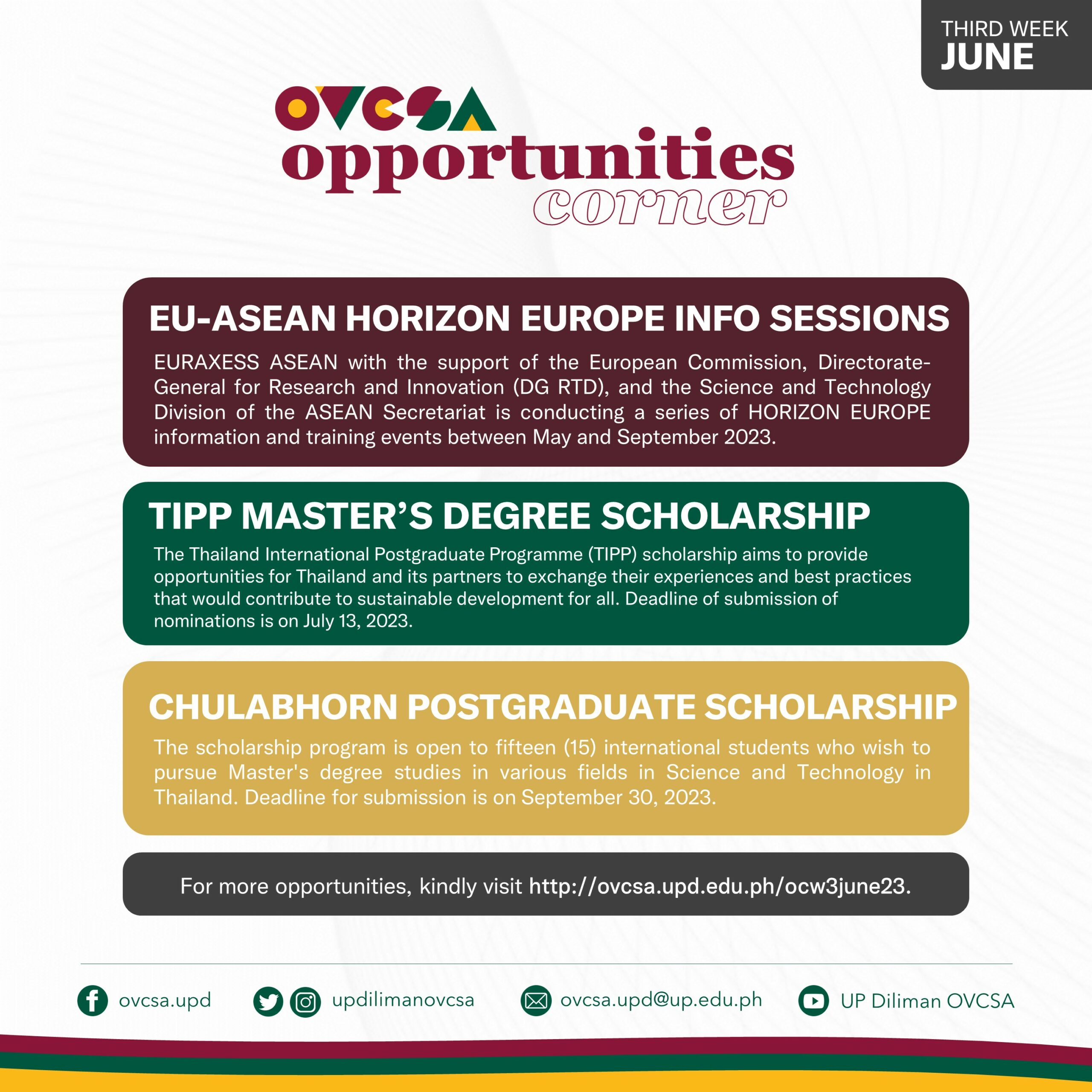 Hello there! The UP Diliman Office of the Vice Chancellor for Student Affairs’ #OpportunitiesCorner is an update on available scholarships, exchange programs, conferences, workshops, and other skill-enhancing initiatives for UP Diliman students. Here’s for the third week of June 2023!