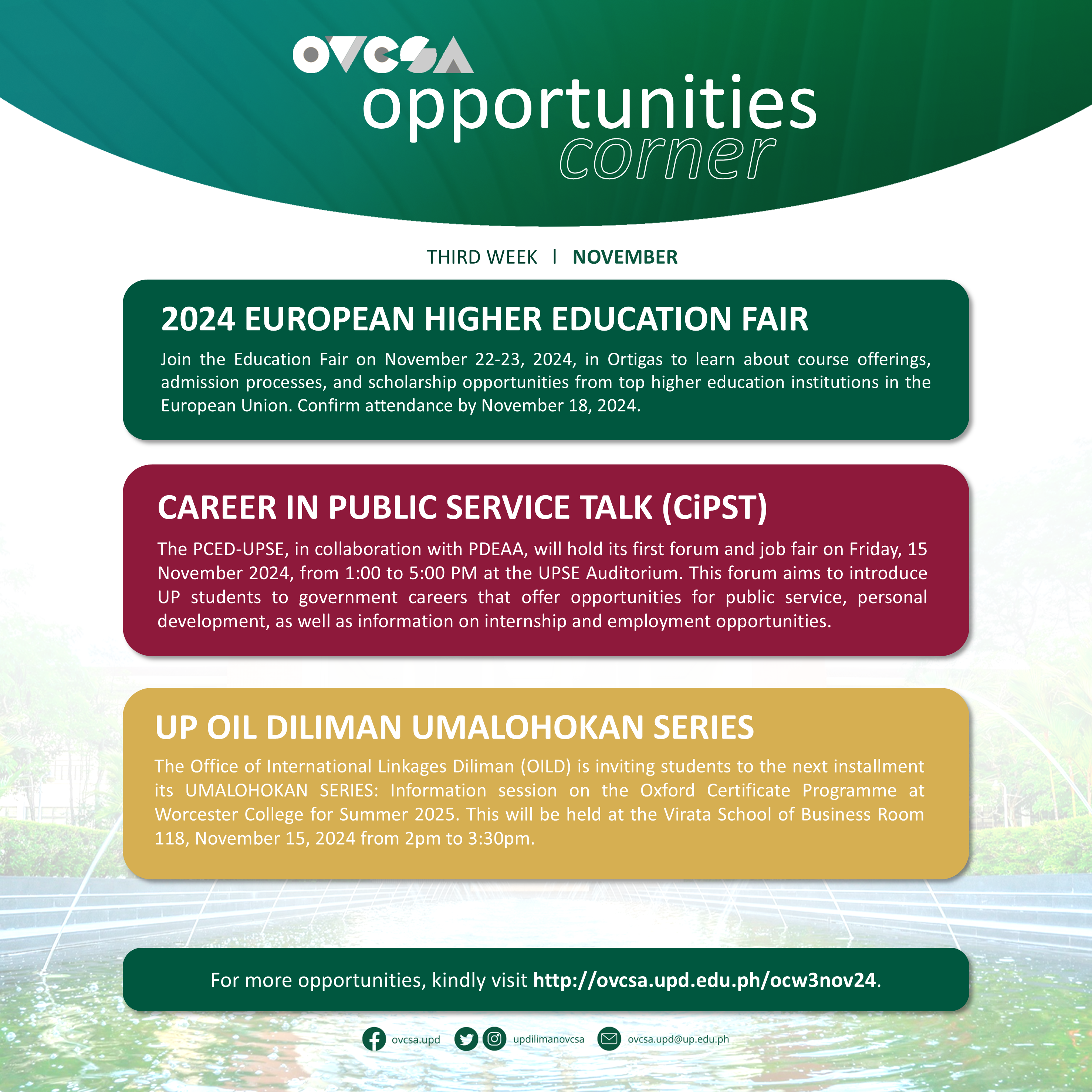 Hello there! The UP Diliman Office of the Vice Chancellor for Student Affairs’ #OpportunitiesCorner is an update on available scholarships, exchange programs, conferences, workshops, and other skill-enhancing initiatives for UP Diliman students. Here’s for the 3rd week of November 2024: