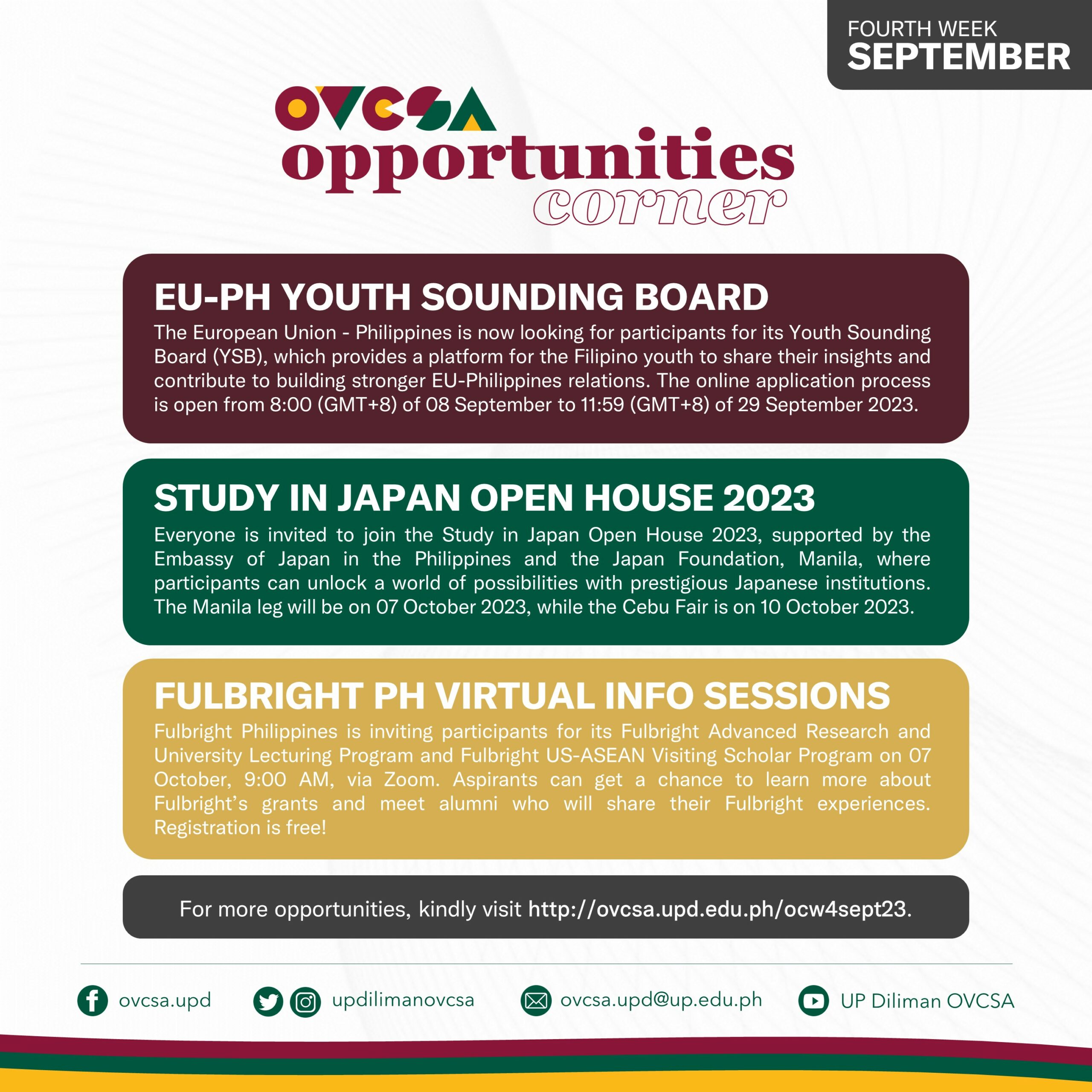 Hello there! The UP Diliman Office of the Vice Chancellor for Student Affairs’ #OpportunitiesCorner is an update on available scholarships, exchange programs, conferences, workshops, and other skill-enhancing initiatives for UP Diliman students. Here’s for the 4th week of September 2023: