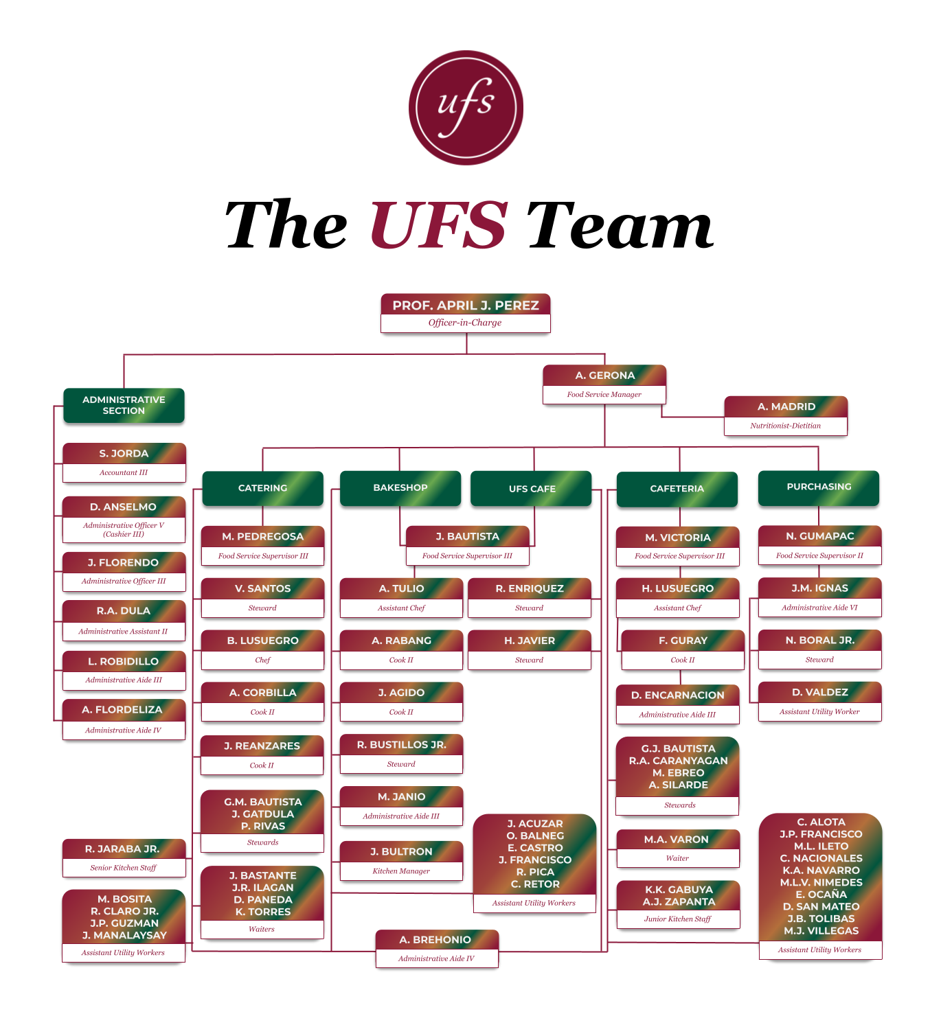 The University Food Service (UFS) serves nutritious, safe, wholesome and reasonably priced food to students, faculty, staff, and guests. The UFS operates three service units: Catering, Bakeshop/Café and Cafeteria. These units are supervised by professional Nutritionist-Dietitians. The Cafeteria prepares and serves inexpensive but nutritious snacks and meals on weekdays. It offers affordable meals for students.