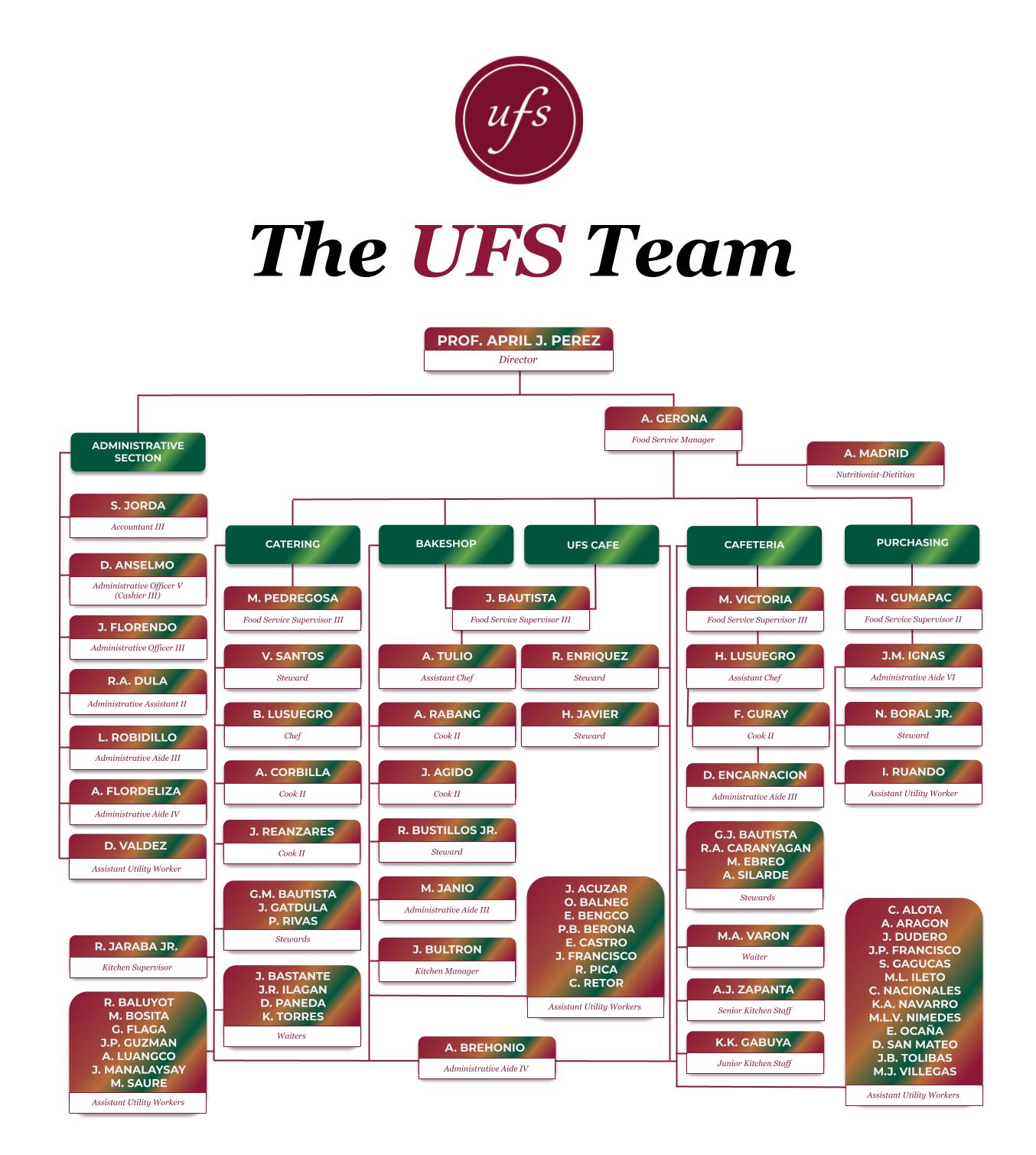 The University Food Service (UFS) serves nutritious, safe, wholesome and reasonably priced food to students, faculty, staff, and guests. The UFS operates three service units: Catering, Bakeshop/Café and Cafeteria. These units are supervised by professional Nutritionist-Dietitians. The Cafeteria prepares and serves inexpensive but nutritious snacks and meals on weekdays. It offers affordable meals for students.