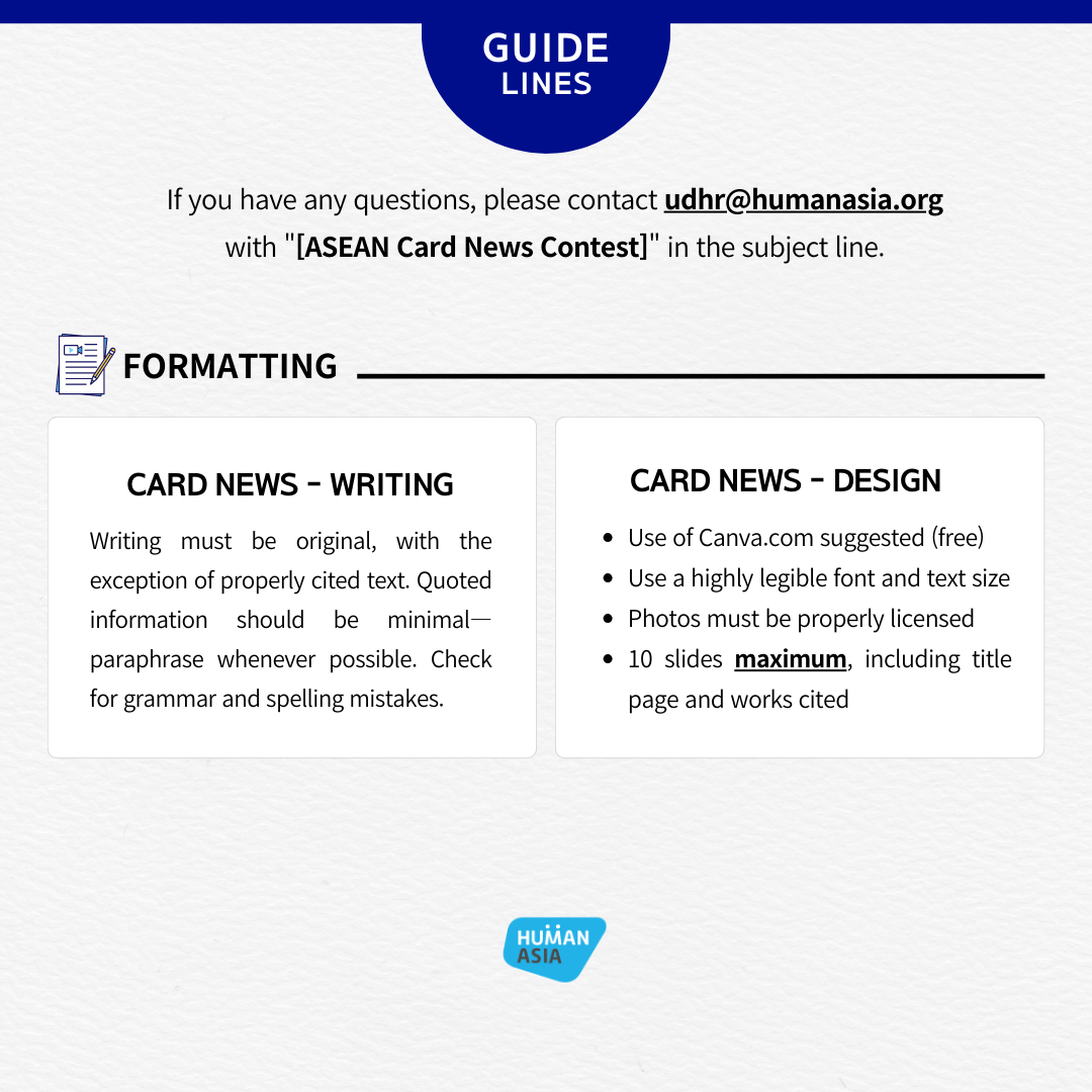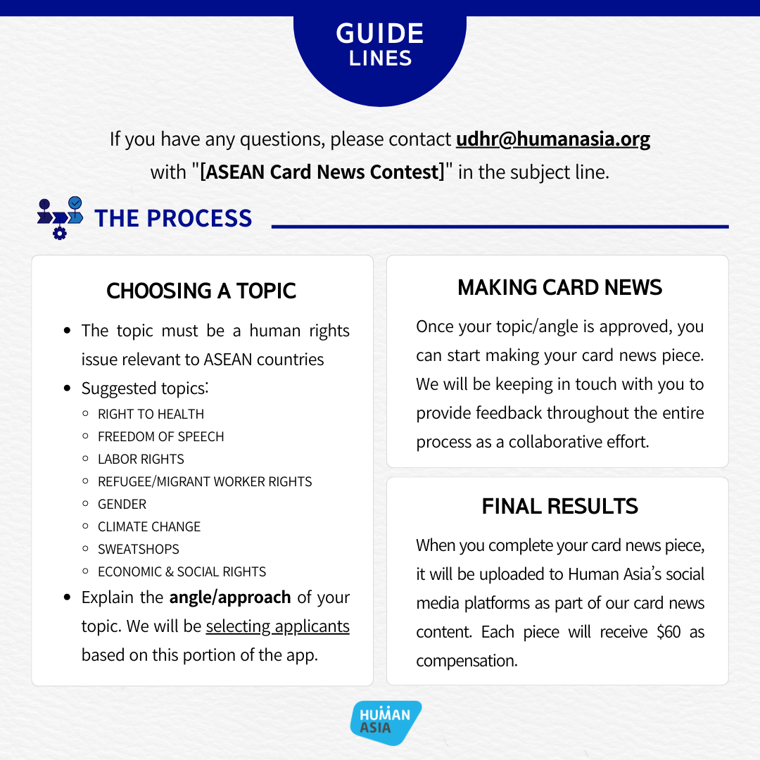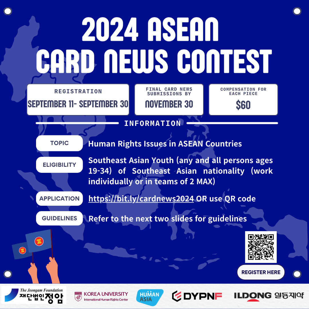 Human Asia, in collaboration with ASEAN youth, invites Southeast Asian youth to join the ASEAN Card News Contest. This contest aims to shed light on various human rights concerns within the region and elevate the voices of diverse ASEAN communities.
