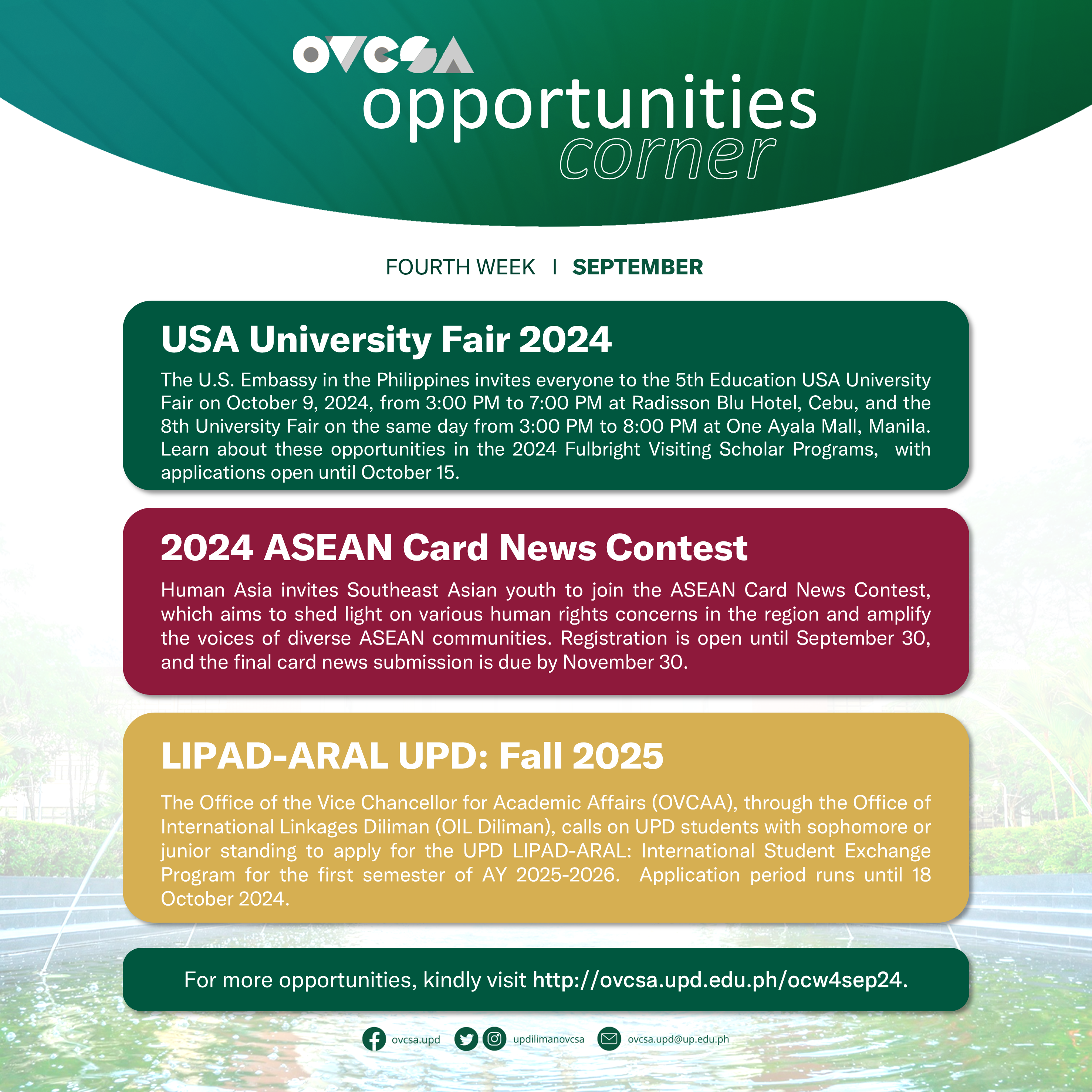 Hello there! The UP Diliman Office of the Vice Chancellor for Student Affairs’ #OpportunitiesCorner is an update on available scholarships, exchange programs, conferences, workshops, and other skill-enhancing initiatives for UP Diliman students. Here’s for the 4th week of September 2024: