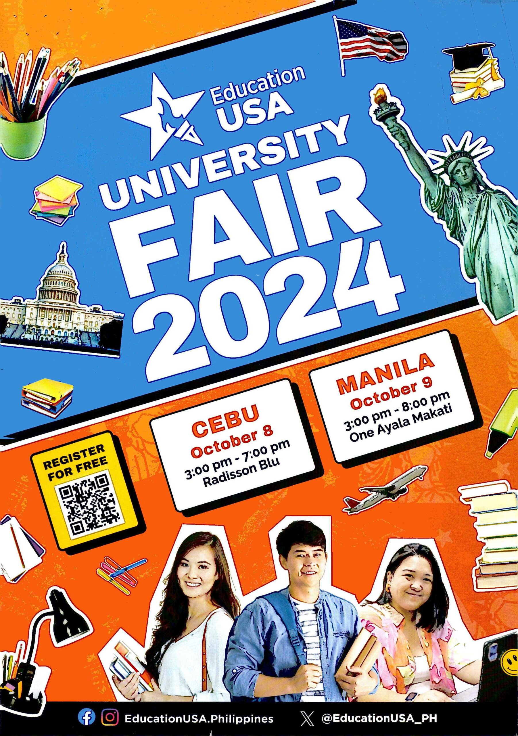 The U.S. Embassy in the Philippines invites everyone interested in pursuing educational opportunities in the United States to attend the 5th EducationUSA University Fair on October 9, 2024, from 3:00 PM to 7:00 PM at Radisson Blu Hotel, Cebu and the 8th EducationUSA University Fair on October 9, 2024, from 3:00 PM to 8:00 PM at One Ayala Mall, Manila.
