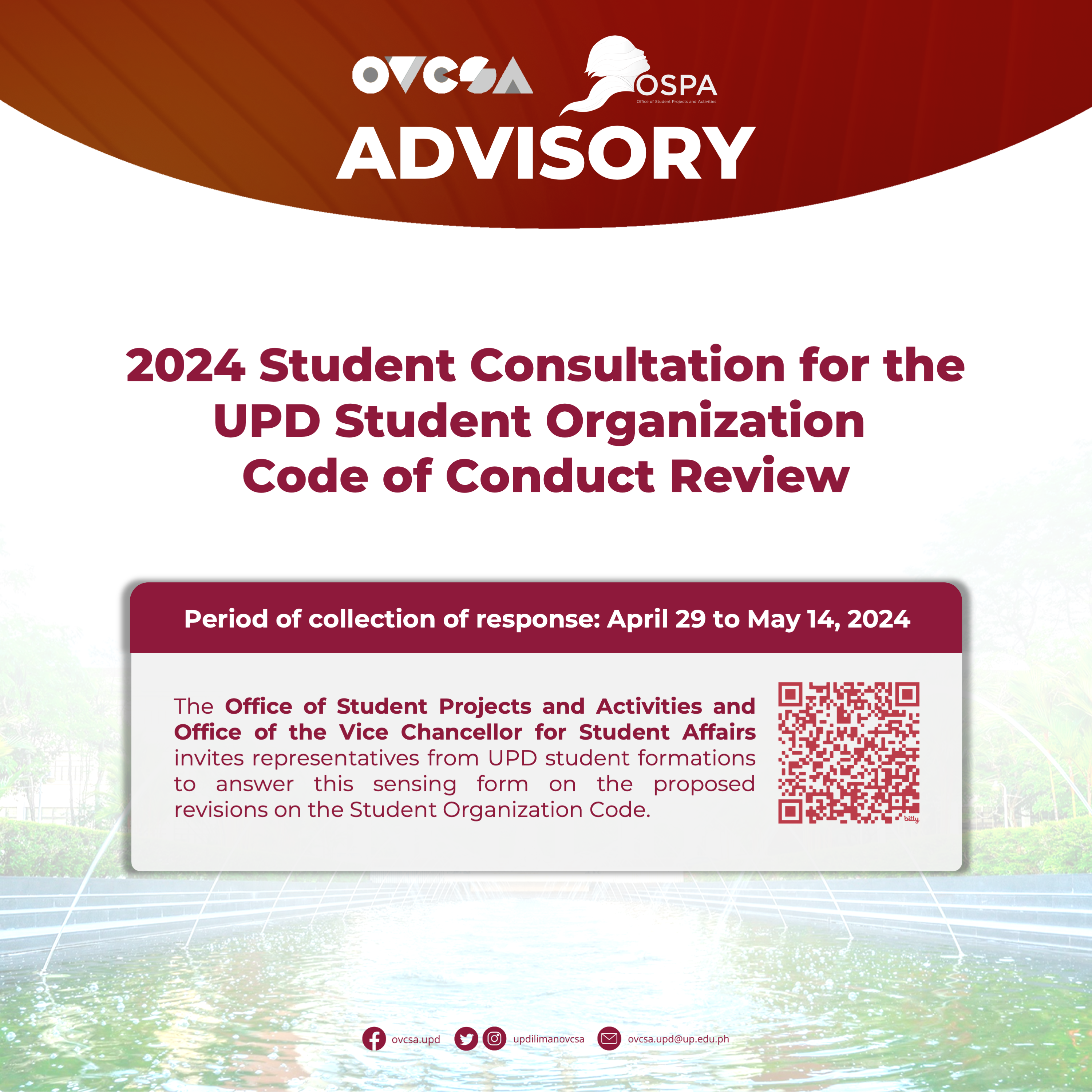 More information on consultation meetings and updates on the Student Organization Code revision will be released. Stay tuned!